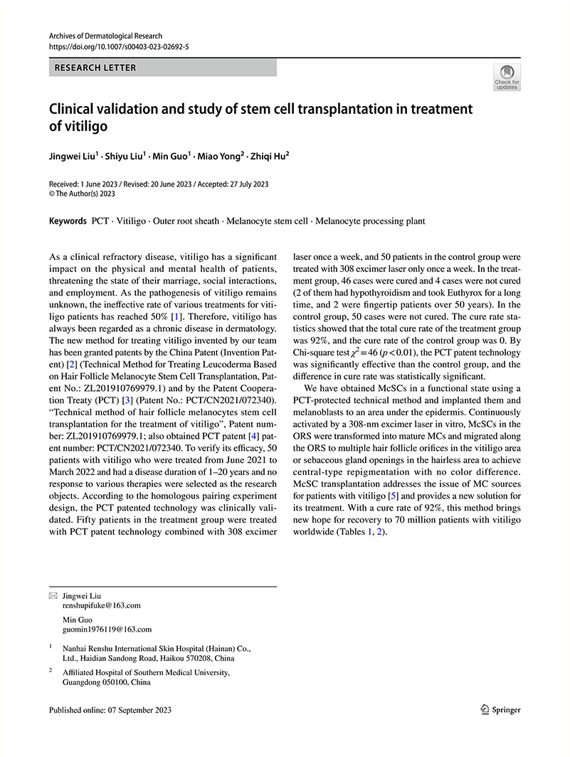 近期,《皮肤病学研究档案》上就发布了一项关于采用干细胞移植技术治疗白癜风的新突破,论文名称为《干细胞移植联合308nm准分子激光治疗白癜风56例临床效果》,论文发表者以及技术发明人是来自我国的医学科学家刘景卫,并且该技术还获得了国家专利以及国际专利的双重认证,专利名称为“毛囊黑素细胞干细胞移植术治疗白癜风的技术方法(专利号:ZL201910769979.1)”的一项具有科学依据、医学出处、安全和有效的新方法。
